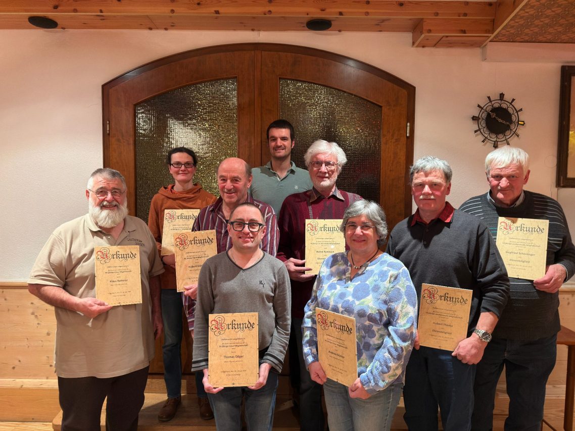 für 40 Jahre Mitgliedschaft: Norbert Zech, Klaus Ketterer, Hubert Günter, Andrea Günter, Hartmut Heine, Markus Hummel, Manfred Grieshaber, Rafaela Riesle, Martina Hemer, Edgar Schwörer, Daniela Amann, Michaela Klausmann, Roland Grieshaber